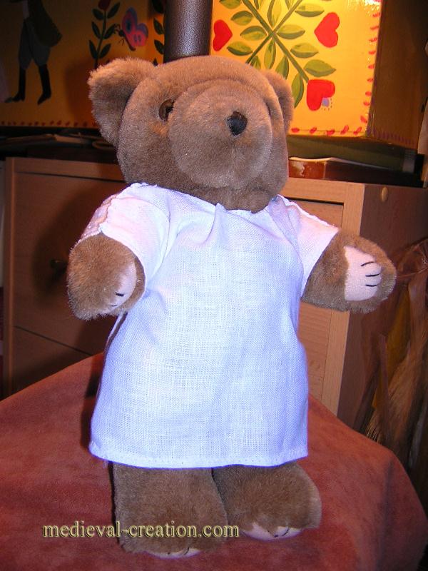 Ici mon Ourson est vêtu d'une Chainse en fort Lin blanc, d'un Kaftan de Laine grise rebrodé à la Main au point de chainette tout autour et fermé d'une ceinture en cuir souple.